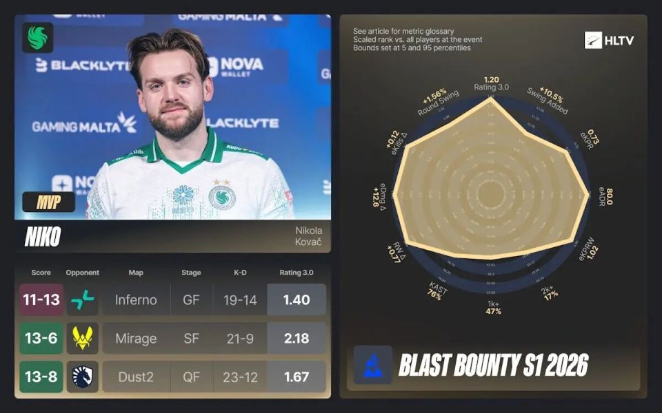 尽管决赛开局状态慢热且队友m0NESY表现平平,NiKo还是幸运地在各种因素的促成下拿到了MVP。在我们的评分体系中,这次赛事的MVP比起那些赛制更长或有更多亮眼个人发挥的赛事的EVP要稍弱一些。