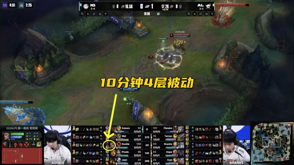 香克斯先出加里奥,Rookie后手选乌鸦Counter,长手打短手的情况下,Rookie没打出一点压制力,甚至在龙团前还被逼出大招,导致IG没法打小龙,最抽象的是,Rookie对线10分钟,只叠到了4层被动,乌鸦E或者W命中就能叠一层,加里奥的E可以抵消乌鸦二段E,但4层真的太少了。