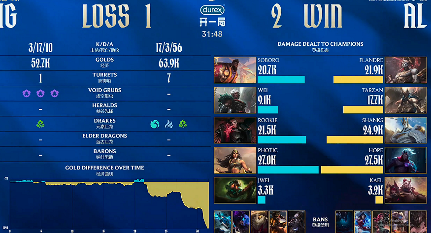 最后的结果,不出所料,AL获胜了,2比1击败了IG,Kael拿到了整局的MVP,妮蔻和洛的发挥,太出色了。但是你还别说,IG还是给到了AL压力,特别是第二把的时候,直接算是被IG碾压了一把,很夸张。当然,最夸张的还是第三把中Rookie的发挥,一手乌鸦,直接带队想要三打五击败AL,确实想太多了,难怪网友们都锐评,Rookie勇气可嘉。接下来一起回顾这轮对决。