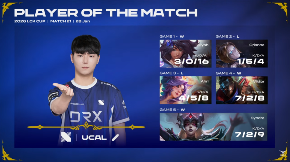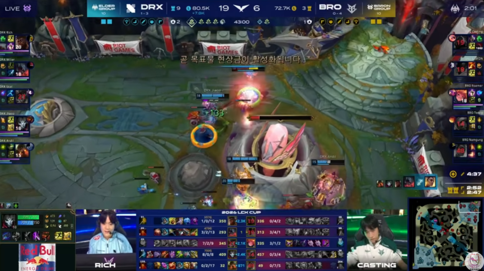 DRX和BRO不愧是两组的倒数第一队伍,那叫一个棋逢对手。虽然LCK顶层队伍之间的强强对决确实很精彩,但也不可否认LCK下游区域也仍然存在低质量的对局。最终在Ucal经验丰富的辛德拉完美表现帮助下,DRX以3-2击败了BRO。
