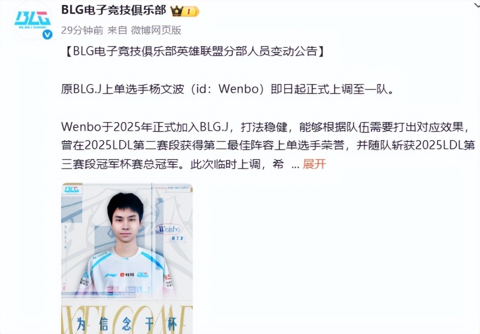本来以为,这些爆料只是捕风捉影,谁曾想,BLG官博都直接发声了,宣布了新上单成员,这个新上单就有意思了,主要是ID有意思,文波。作为LDL的最佳上单,文波还随队拿到过第三赛段冠军杯赛的总冠军,有点实力的,突然的临时上调,还挺让人期待的。只是,Bin大哥就真的跑路了吗?以后BLG还会有这么多粉丝吗?