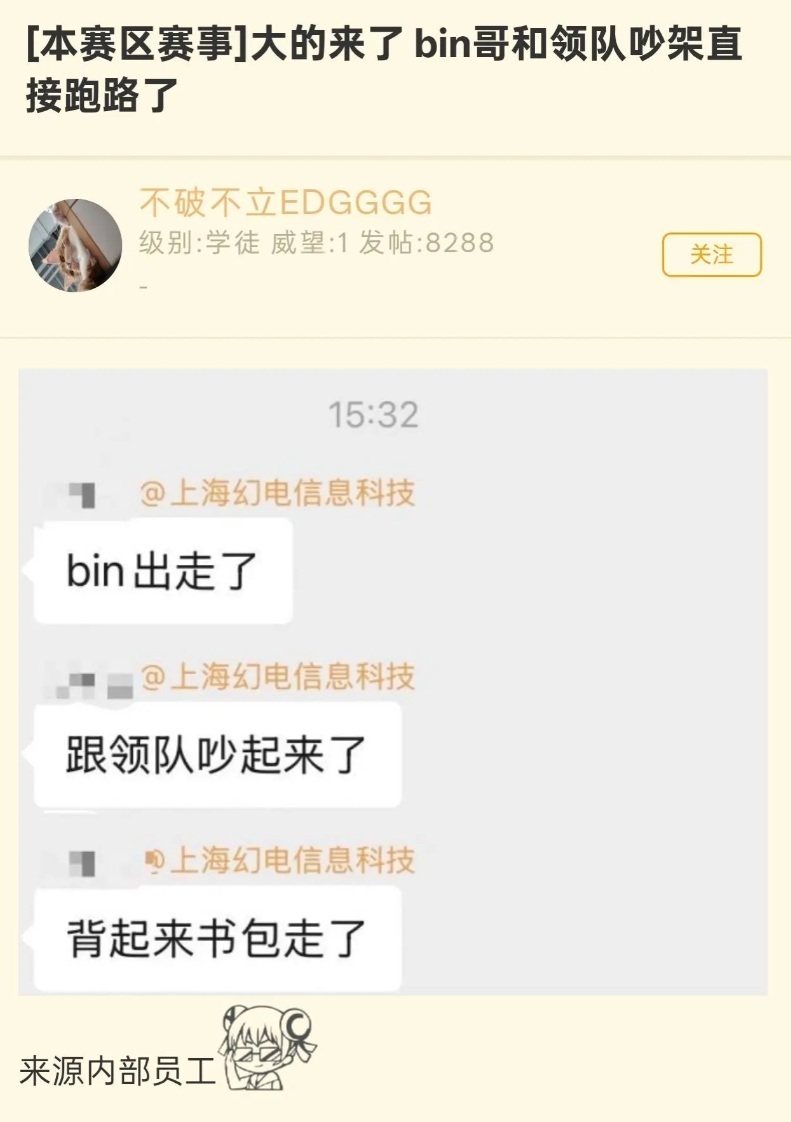 最开始的爆料是在某论坛,有网友爆料说Bin因为和领队出现矛盾,骂领队后直接背着包跑路回家了,随后尧阿尧也给出了类似的爆料,在群里面透露说Bin被下了,人已经回老家了,原因是骂老板了。