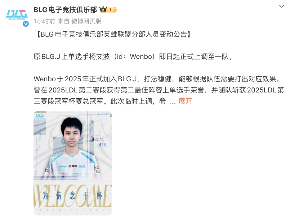 BLG官方发布公告,临时上调二队上单