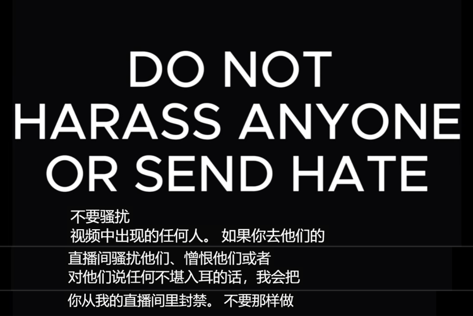 在视频的开头和结尾,他也表示“不要去骚扰相关者,否则在直播间里一律封禁”。