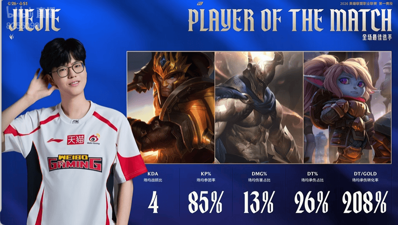 擎天白玉柱!Jiejie拿到WBG对阵JDG比赛的全场MVP