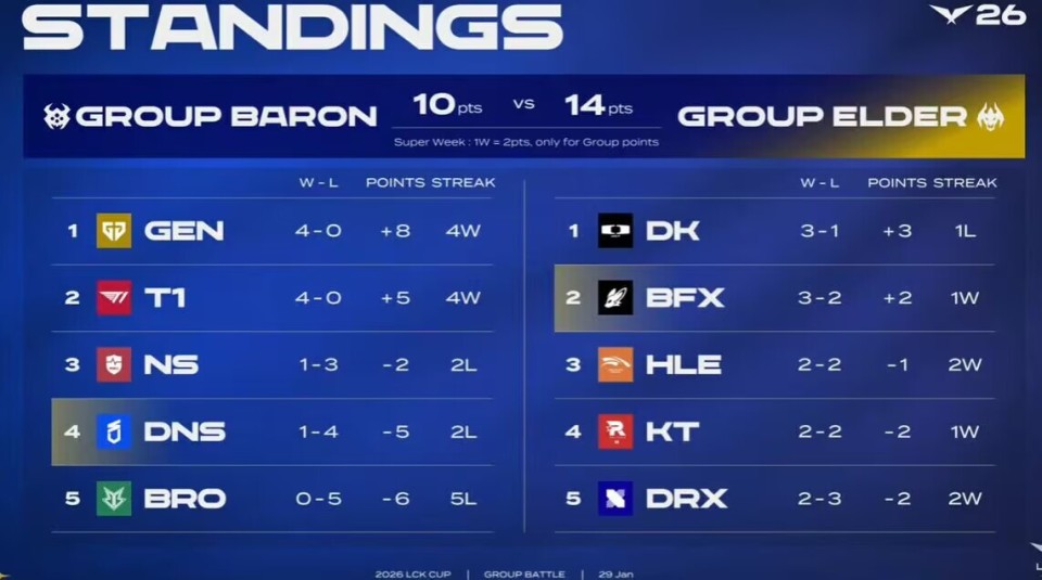 LCK第一赛段超级周,只剩下3场BO5就结束了,上一个比赛日,DNS和BFX展开较量,这两队的硬实力差距很大,所以只打了4局就分出胜负,BFX获胜为远古龙组再拿2分,两个组的积分差距,现在被拉大到了4分,如果后续的比赛,大龙组还是赢不了的话,胜者组就是远古巨龙组了。