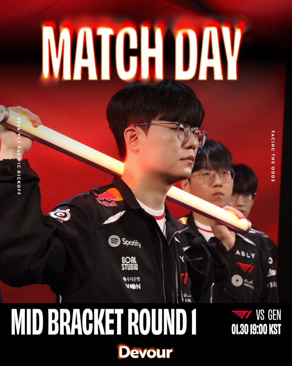 虎扑01月30日讯 T1官方发布2026 VCT Pacific Kickoff对阵GEN赛前海报,配文:请粉丝们多多支持!