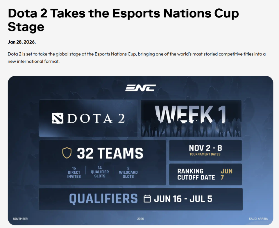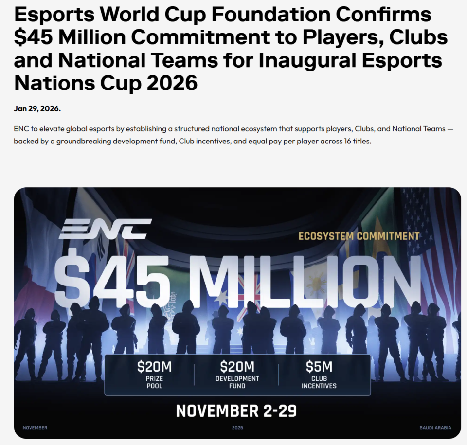 IT之家 1 月 30 日消息,沙特阿拉伯利雅得当地时间 1 月 29 日,电竞世界杯基金会(EWCF)公布 2026 年电竞国家杯(ENC)的赛事举办日期及奖金体系。这一全新全球电竞赛事以国家队为核心,首届赛事定于 2026 年 11 月 2 日至 29 日在沙特阿拉伯利雅得举办。