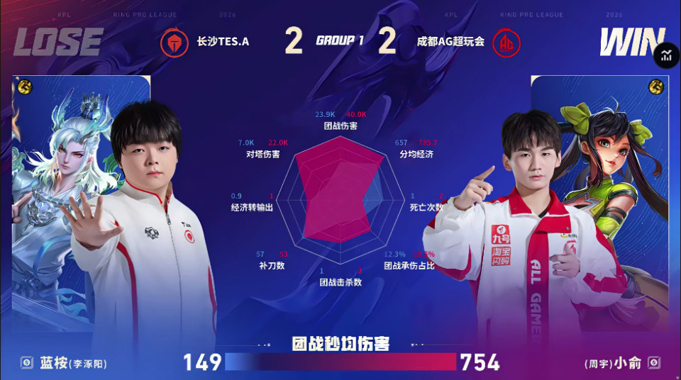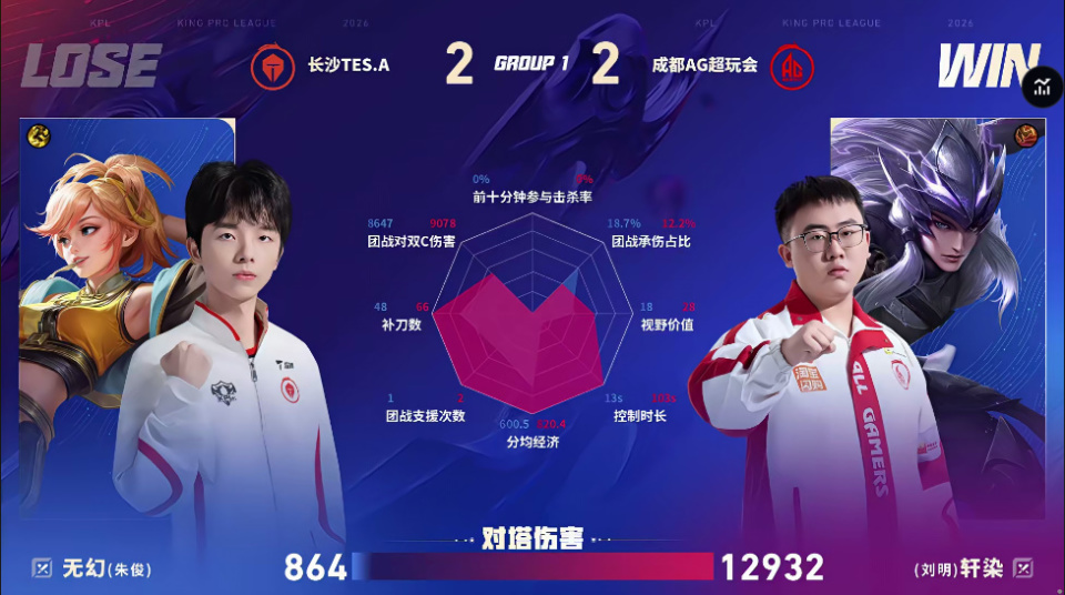 AG/TES第四局数据对比:轩染马超伤害占比高达百分之三十五