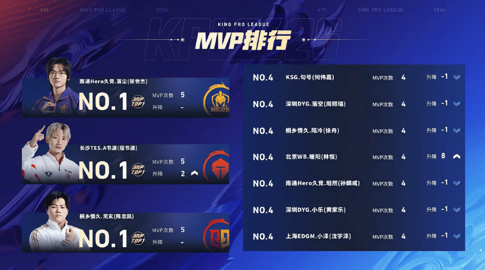 长沙滔搏丶书源 (寇书源)排名上升2名,累计获得5次MVP,与南通Hero久竞_落尘 (张世杰)、桐乡情久-无玄 (陈志凯)并列MVP排行榜首。