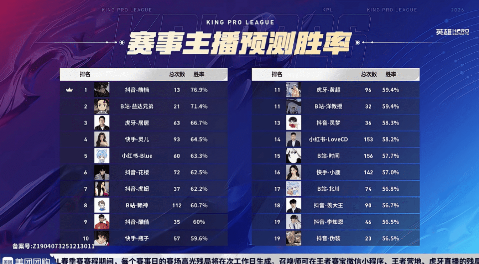 抖音-皓楠胜率76.9%,位于排行榜第一。