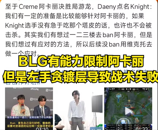 而在赛后采访环节当中,丹神也是公开回应自己放给小奶油阿卡丽的原因。丹神表示BLG有很多种方法限制阿卡丽,所以自己选择相信左手,让左手拿维克托去对线阿卡丽。但是在比赛期间左手因为贪镀层导致被阿卡丽单杀,最终导致BLG战术失败,如果左手不贪镀层,那么比赛结果可能会不一样。(你们觉得丹神这个解释是否合理?BLG输给TES是不是BP问题?)