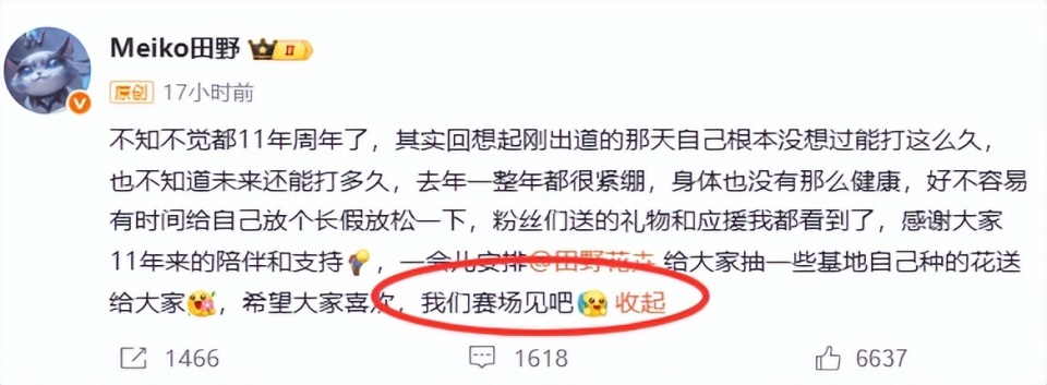 让IG粉丝们开心的是,田野已经宣布消息了,一句赛场见,充满期待啊,表示不会休息很久了,很快就能够赛场见了,之前休息这么久,也是因为在保养身体,调整心态。作为LPL唯一的大满贯选手,田野的荣誉是拉满的,相信找回状态之后,肯定能够帮助IG摆脱困境。