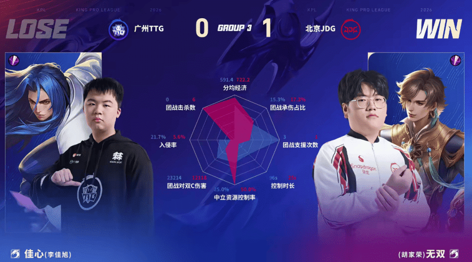 虎扑01月31日讯 JDG/TTG第一局数据对比:无畏张飞团战支援成功率百分百