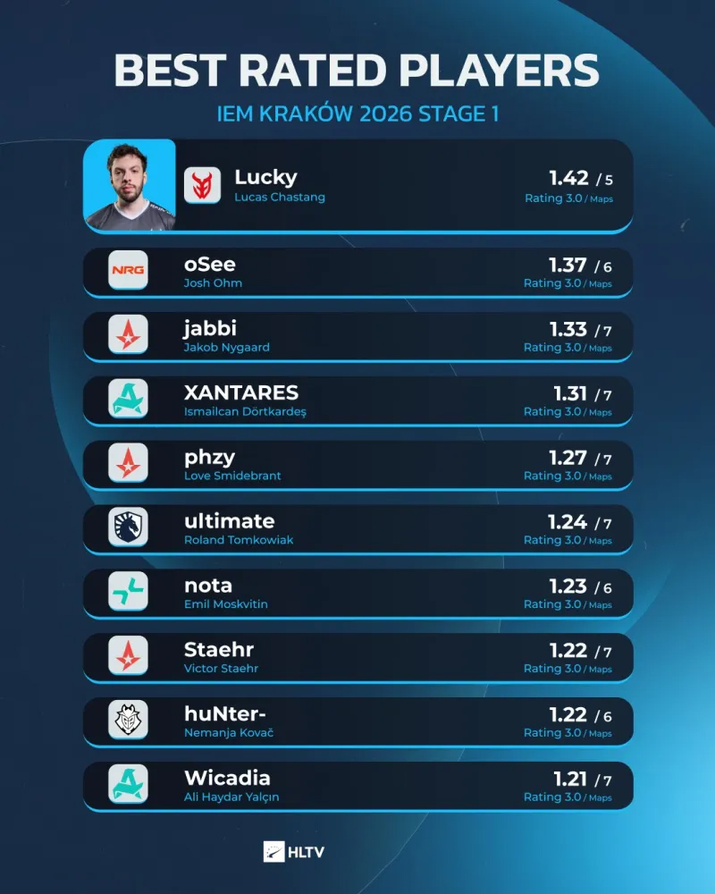 随着IEM克拉科夫站2026第一阶段结束,选手个人数据榜正式出炉,多位选手打出了爆炸级表现。