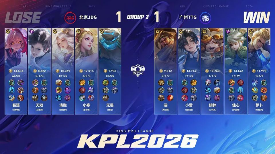 TTG3-1战胜JDG,第一阶段4-1收官,依然保留了进入S组的希望。小雪这场比赛是C麻了,给新人小寒上了一课。而无双的表现依旧是破绽级别,这不能怪观众给压力。