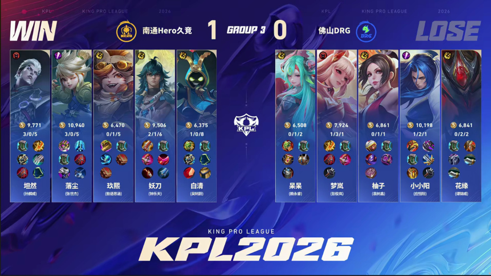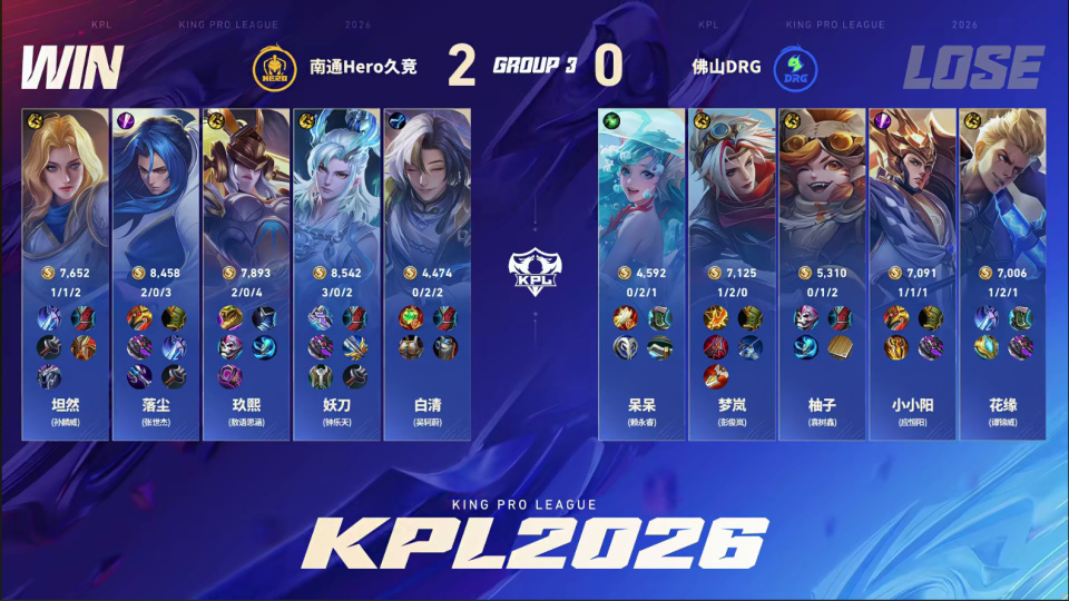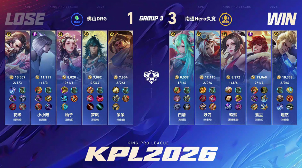 DRG守家时,杨玉环二闪接苏烈A闪大招,推回了落尘的裴擒虎。但落尘死之前换出了复活甲。火舞闪现进场打残梦岚,老虎复活刚好扑上去收割,又一口把杨玉环秒了。小小阳的镜这局也完全没秀起来,Hero3-1拿下,第二轮确定A组。