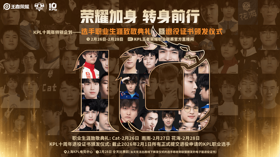 在KPL十周年到来之际,为表达对选手多年付出的感谢,KPL官方将推出十周年选手致敬典礼;同时,为所有正式提交退役申请的KPL职业选手颁发退役证书(包括已提交申请者和未来提交申请者)。