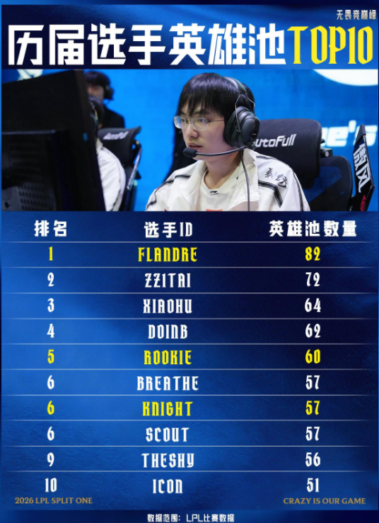 TheShy位列第九、Icon第十,反而更有讨论空间,TheShy的英雄池并不算少,但他的标签始终是极致对线和个人压制,这让人们容易忽略他的广度,而Icon的51个英雄,则更像是一个传统中单在多个版本中的生存记录。