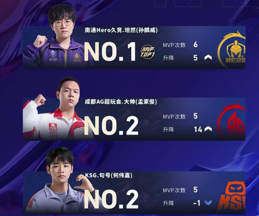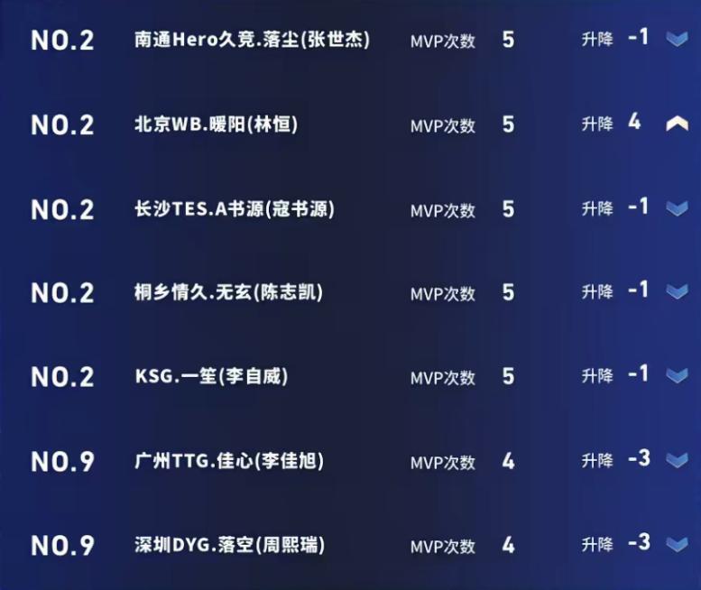 第一只有一个,但第二名却有七个,分别是AG大帅(游走)、KSG句号(打野)、Hero落尘(打野)、WB暖阳(打野)、TES.A书源(打野)、桐乡情久无玄(对抗路)、KSG一笙(游走),这七名选手获得MVP的次数均为5次,因此共同排在榜二的位置。
