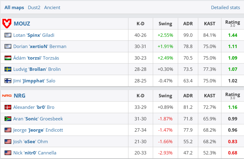 图一Dust2,Sonic与br0轮番爆发,br0从A小到平台单局4杀,NRG半场进攻拿到7分。换边Spinx领衔MOUZ全员发威,一波7-0攻势直接拿下赛点。NRG只是稍作抵抗,MOUZ先下一城。图二Ancient又复刻图一剧情,乔治、br0与nitr0火力全开,半场防守豪取8分。下半场MOUZ又是全员状态在线,直接打出一波9-1铁血防守终结比赛。