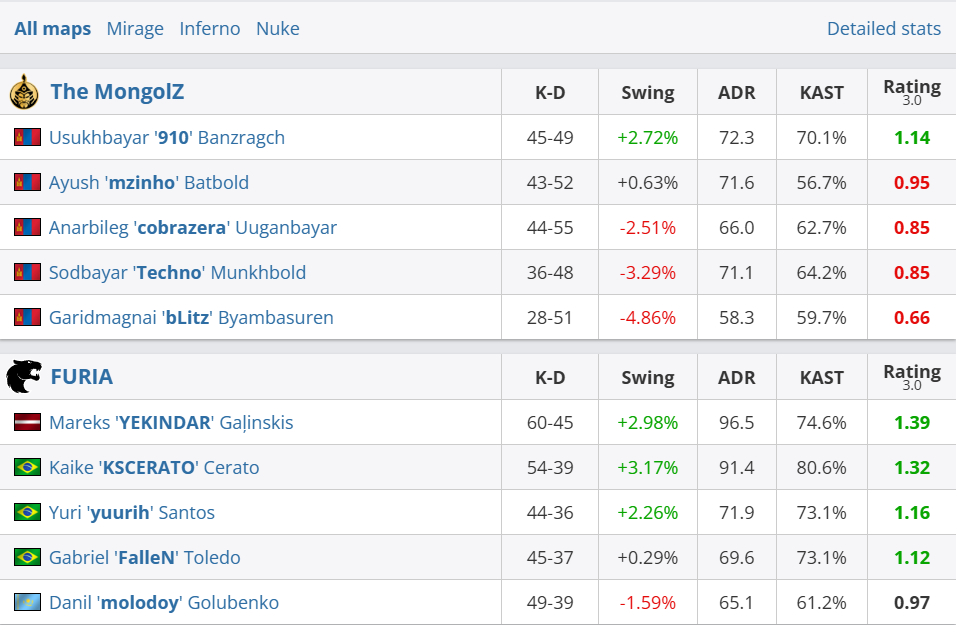 图一Mirage,MongoIZ上演追分大战,他们在防守方稳扎稳打先下一城。图二Inferno两队指挥状态神勇,bLitz香蕉道5杀灭队,FalleN更是时隔5年在香蕉道完成1V5!FURIA众人多次逆境起势,队内明星选手轮番上阵最终加时扳回一城。决胜图Nuke完全是FURIA的单方面吊打,蒙古队一胜难求出局。