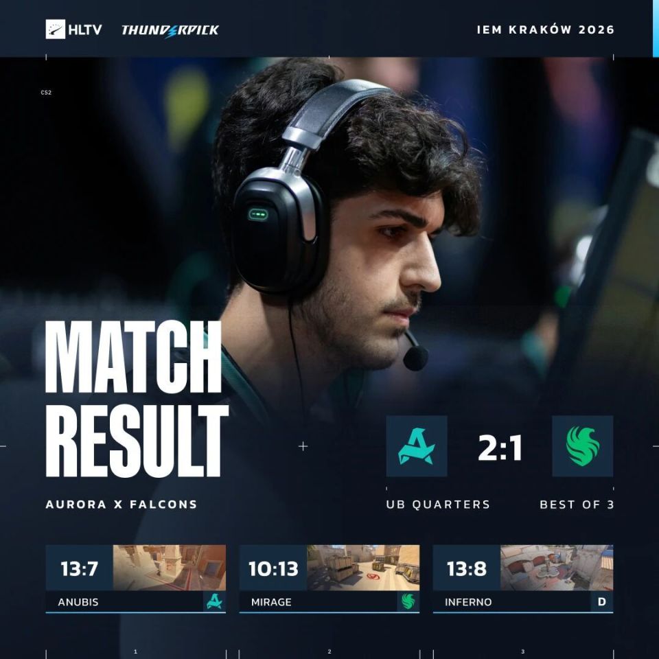 决胜图Inferno,土耳其队赢下手枪局进攻5-1开。而后随着小孩起势,龙哥大坑3杀,京介香蕉道4杀,猎鹰半场追至6平。换边Aurora再拿手枪局随即前顶香蕉道被猎鹰翻盘,结果Falcons进攻A区被关也被翻盘,而后NiKo两局都差点经济局翻盘,猎鹰越打越急被狠人在A1刷了4个,Aurora以铁血防守终结比赛。