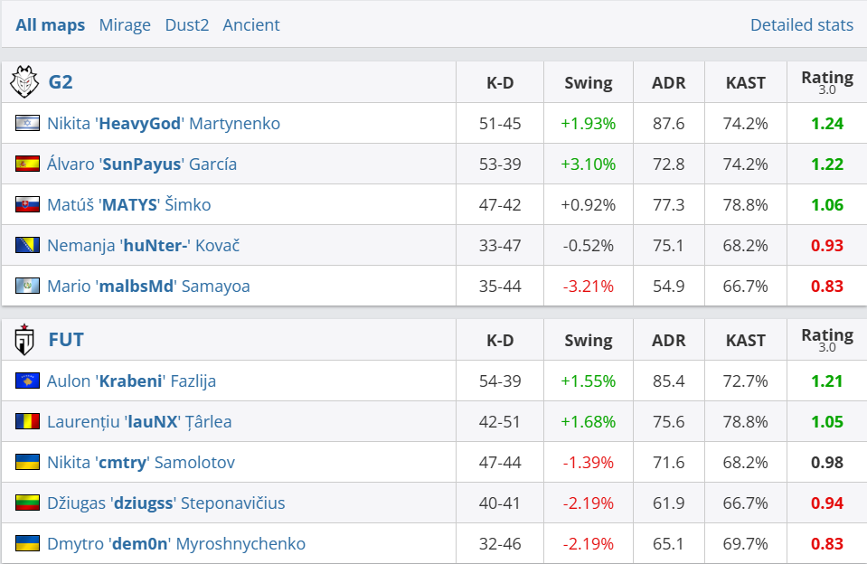 图一Mirage,G2拿下手枪局打出7-2梦幻开局,但随后lauNX开始强势崛起,单图狂砍28个人头。FUT从上半场后期到下半场打出一波11-2狂潮完成逆转。图二Dust2,G2一扫上图颓势,太阳神领衔全员在线,半场进攻手握9分,换边更是早早以12-4拿到赛点,稳稳扳回一城。来到决胜图Ancient上G2状态火热,进入到下半场则是一路平推晋级淘汰赛。