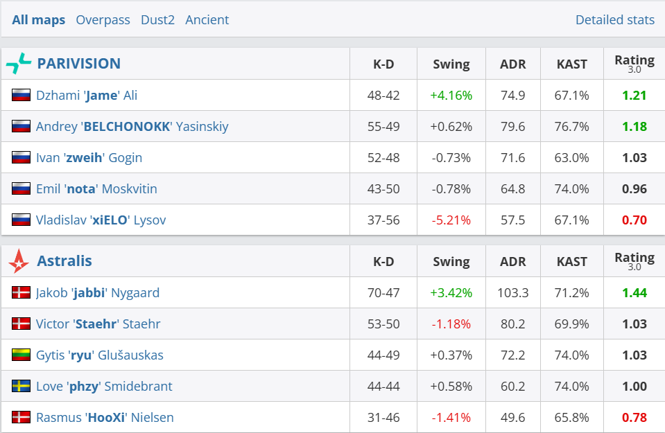Astralis在三张地图的上半场都取得了不错的领先优势,除了在图二让对手拖入加时完成翻盘外,在另外两张地图A队最终都把握住了机会将胜利收入囊中。而BLAST赏金赛S1冠军PV,则止步IEM克拉科夫16强。