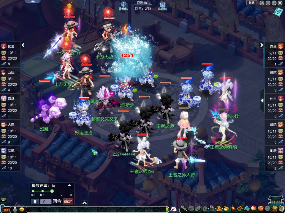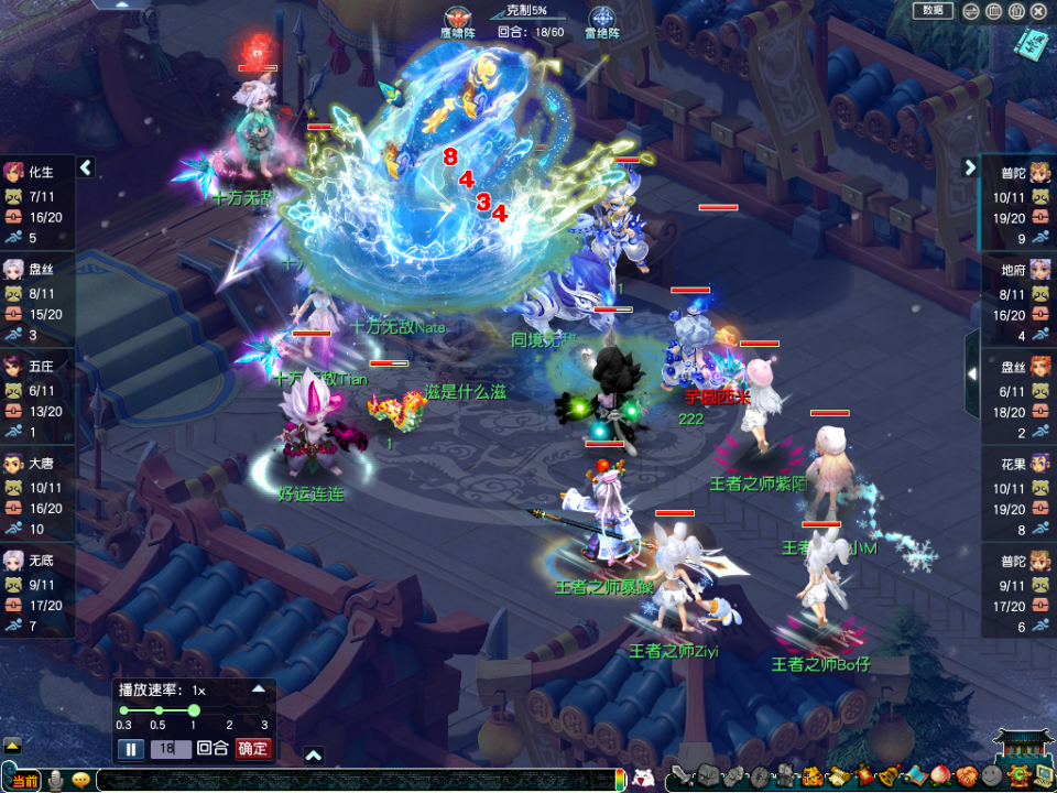 【王者之师】(观战方)阵容为:咒师普陀、地府、盘丝、花果山、咒师普陀;