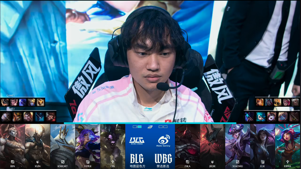 第二局比赛,BLG蓝色方,禁用:发条;皇子;杰斯;梦魇;猴子,选用:Bin亚恒;Xun潘森;Knight加里奥;Viper芸阿娜;ON牛头;WBG红色方,禁用:石头人;波比;露露;格温;挖掘机,选用:Zika塞恩;Jiejie剑魔;Xiaohu辛德拉;Elk卡莎;Erha妮蔻