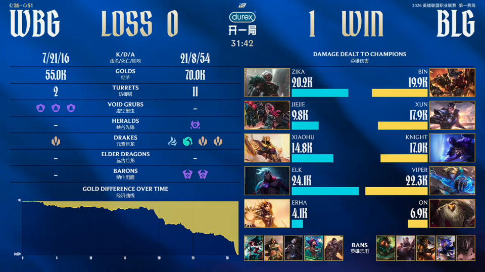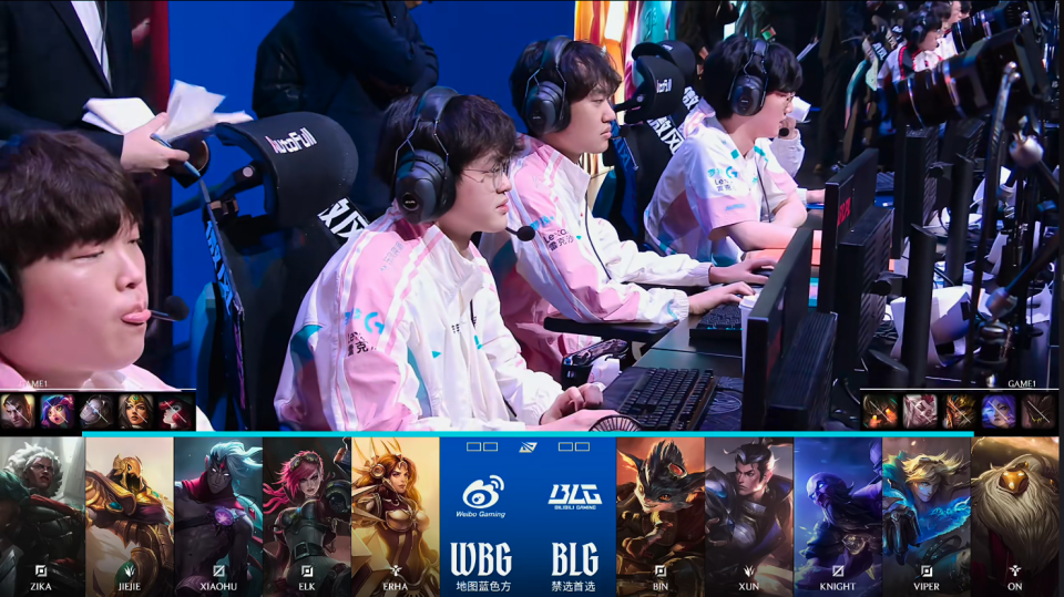 第一局比赛,WBG蓝色方,禁用:杰斯;妮蔻;发条;希维尔;女枪,选用:Zika狼母;Jiejie蔚;Xiaohu沙皇;Elk韦鲁斯;Erha蕾欧娜;BLG红色方,禁用:石头人;芸阿娜;皇子;洛;泰坦,选用:Bin兰博;Xun赵信;Knight瑞兹;Viper伊泽瑞尔;ON巴德