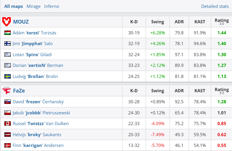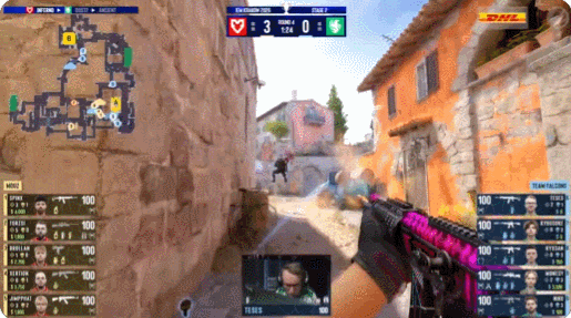 本场比赛双方韧性十足,两张图均打进加时。图一Inferno虽然猎鹰依靠沙鹰大队追进加时,但加时赛14-13时3V3的关键局,kyxsan没等队友闪爆就拉出丢掉赛点,终局NiKo不等烟爆拉出又被架死丢掉图一。