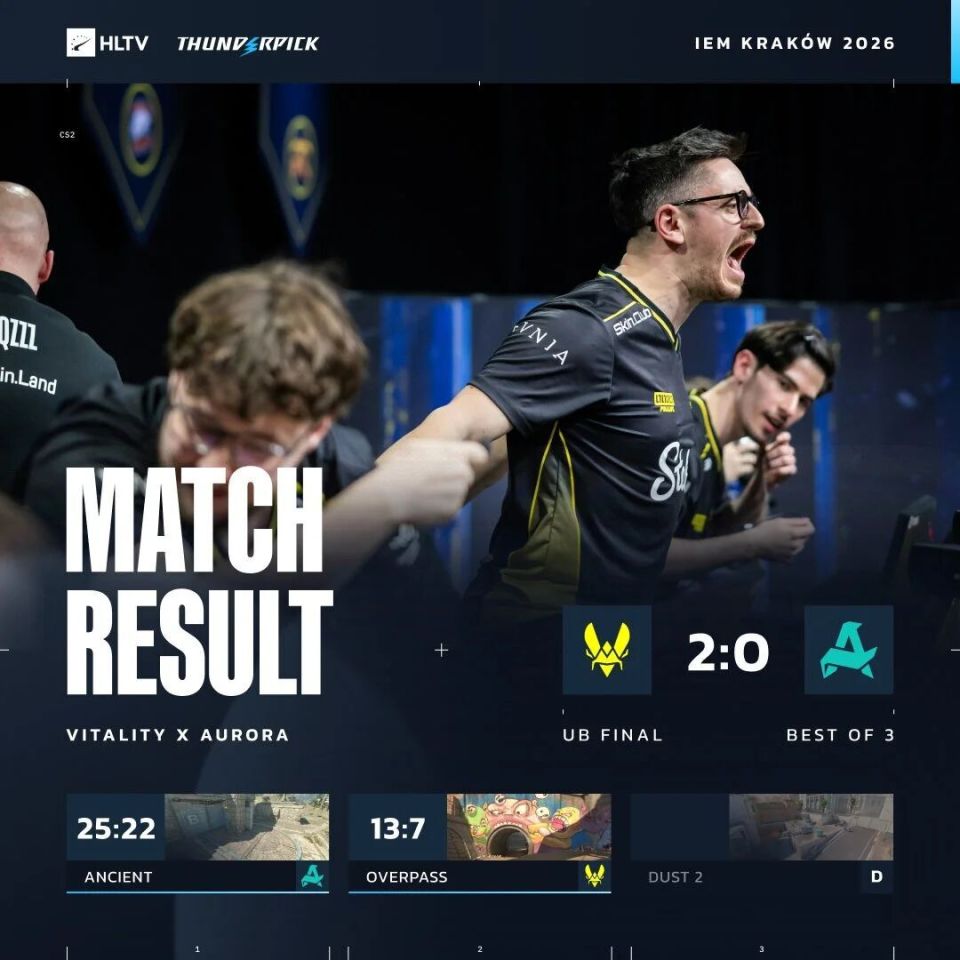 胜者组决赛:Vitality 2-0 Aurora,晋级四强