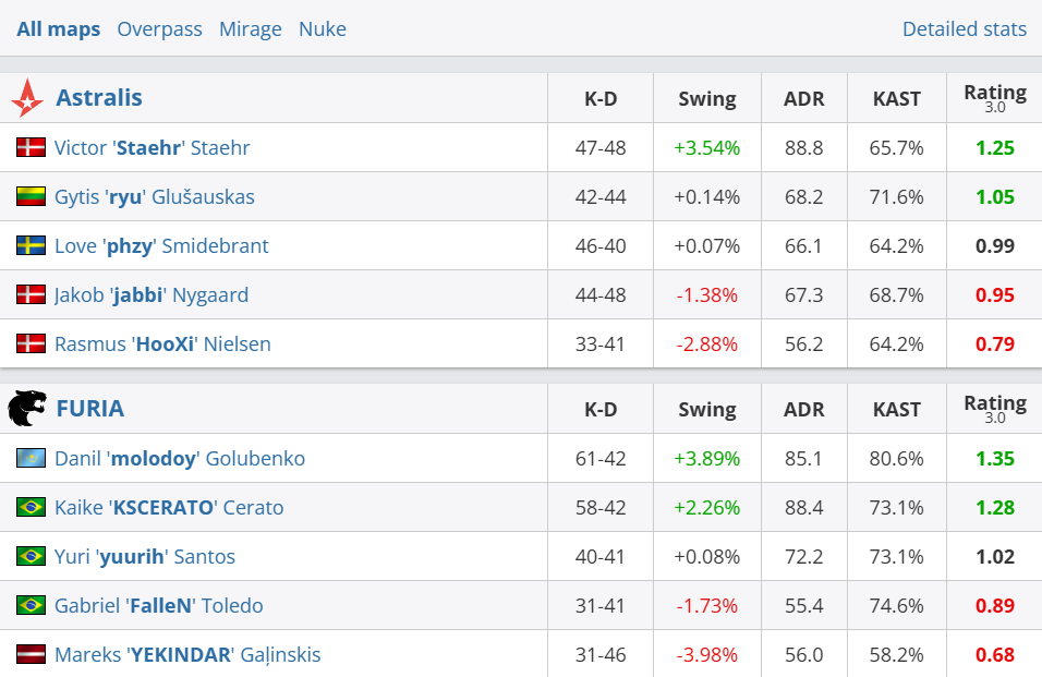 决胜图Nuke,依靠队内明星选手molodoy和KSCERATO的无解发挥联手44杀,FURIA最终让一追二击败Astralis锁定淘汰赛席位。
