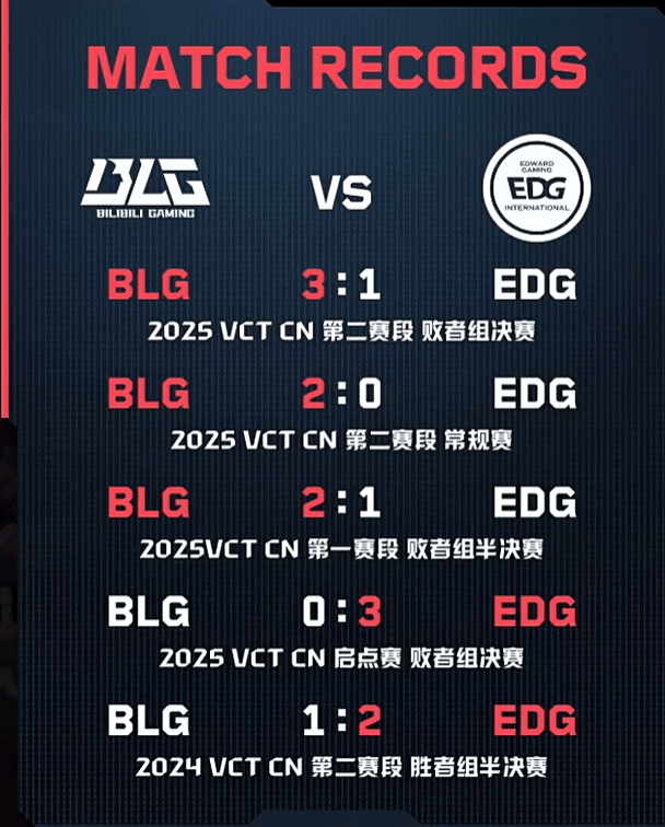 至此,在VCT联赛里,BLG面对EDG已经达成四连胜。