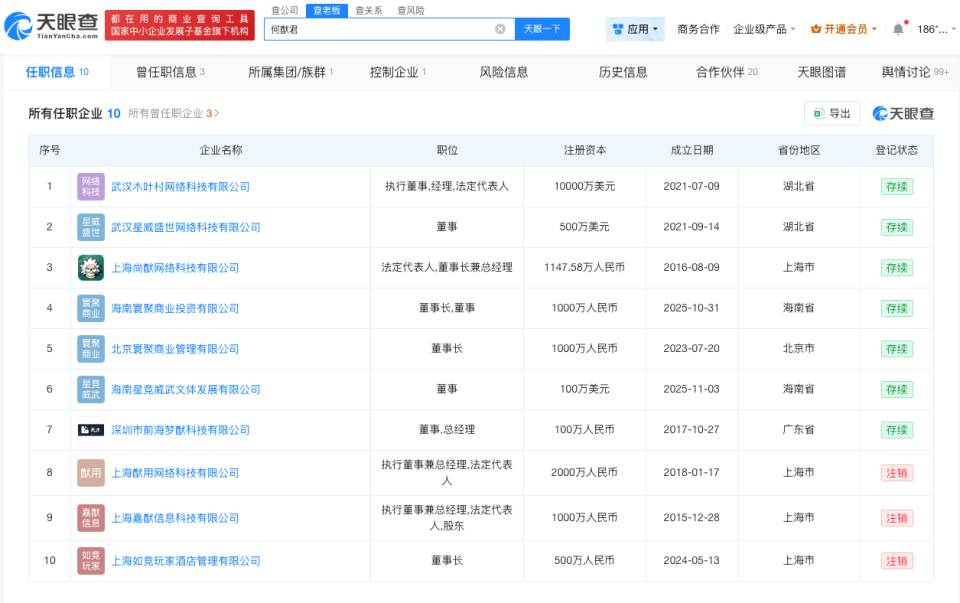 天眼查显示,何猷君名下关联10家企业,其中7家为存续状态,何猷君在上述企业中担任执行董事、经理、法定代表人等职务,版图涉及科技、商业投资、文体等领域。