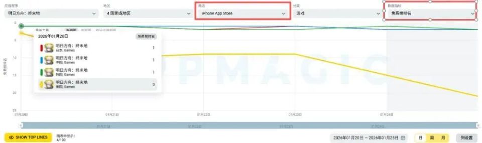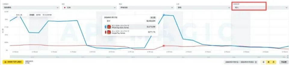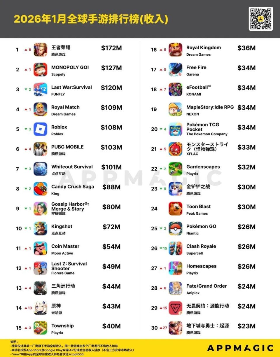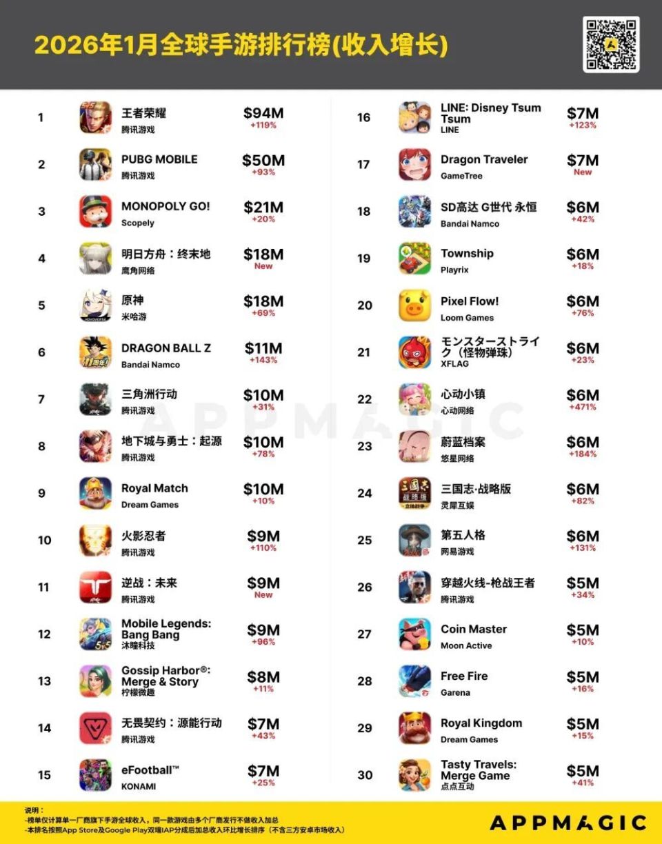 近日,移动应用市场研究机构AppMagic公布了2026年1月的全球手游收入排行榜及增长榜。(注:数据仅基于玩家在App Store和Google Play上的消费所产生的总收入,不包含第三方商店或网页商店数据,且已刨除平台分成)数据显示,2026年1月移动游戏市场全球玩家支出约65.27亿美元,环比增长4.7%,市场整体增速较去年12月有所回升。在收入排名方面,腾讯旗下《王者荣耀》以超过1.72亿美元(约合11.9亿元人民币)的月收入夺得第一,环比实现翻倍增长。该游戏在1月推出S42新赛季、新英雄及多款限定皮肤,有效拉动了玩家付费。据AppMagic估算,《王者荣耀》游戏日分成后收入整体稳定在450万美元以上,月内存在短期回落节点(仅1月29日分成后收入约290万美元),但整体仍在高位运行。超休闲游戏《MONOPOLY GO!》以1.27亿美元(约8.8亿元人民币)排名第二。在全球手游市场,超休闲具有明显的持续吸金能力。FUNFLY发行的《Last War: Survival》以1.20亿美元(约8.3亿元人民币)的月收入位居第三,这一游戏于2023年推出,凭借各种特色活动以及版本更新持续推动游戏收入增长。Dream Games的《Royal Match》与UGC平台《Roblox》位居第四、第五,收入分别为1.09亿美元(约7.6亿元人民币)、1.08亿美元(约7.5亿元人民币)。第六至第十名依次是《PUBG MOBILE》《Whiteout Survival》《Candy Crush Saga》《Gossip Harbor®:Merge & Story》《Kingshot》,其中多款产品收入较上月出现波动,反映出头部市场竞争的激烈。值得注意的是,腾讯在本月共有6款游戏进入收入榜TOP30。其旗下英雄射击手游《无畏契约:源能行动》上线5个月后,于今年1月首次跻身全球收入榜,分成后收入突破2300万美元,显示出较强的增长潜力。此外,一些长线运营产品通过版本更新与活动策划,同样实现了收入回升。例如米哈游《原神》在1月推出大型版本更新及预热福利活动,带动单日全球分成后收入达600万美元,创下半年单日第新高,并在多国畅销榜名列前茅。XFLAG旗下日本经典弹珠卡牌RPG手游《モンスターストライク(怪物弹珠)》也凭借持续的内容运营,1月分成后收入环比增长610万美元,而同期下载量仅增长2万。据AppMagic数据追踪,自2013年9月上线以来,该游戏始终维持行业领先的RpD(平均每下载付费金额)水平,其收入波动更多由核心iOS用户付费行为驱动;相较之下,游戏下载走势双端表现基本一致。《モンスターストライク》(怪物弹珠)1月双端收入表现整体来看,1月全球手游市场在传统旺季加持下保持活跃,老牌产品与新兴游戏共同推动行业收入增长,厂商通过赛季更新、限定活动等方式持续激发用户付费意愿,市场竞争格局依然动态变化。增长榜:《心动小镇》收入环比暴增471%,《终末地》闯入TOP5在1月的全球手游收入增长榜中,腾讯的《王者荣耀》位列单月收入第一,另一游戏《PUBG MOBILE》位居第二,scopely的《MONOPOLY GO!》排名第三。新游方面,鹰角网络《明日方舟:终末地》于1月22日开启全球公测。游戏在预下载阶段便登顶中、日、韩iOS免费榜,并位列美国市场第三。其融合即时战斗、开放探索与模拟经营的多元玩法,吸引了原有IP粉丝与泛RPG用户,推动游戏成功进入全球手游收入增长榜前五。《明日方舟:终末地》核心市场预下载当日iOS免费榜排名表现老游戏也有亮眼表现:腾讯《逆战:未来》1月国服iOS分成后收入超870万美元,与已有的《三角洲行动》(搜打撤赛道)、《PUBG MOBILE》(大逃杀赛道)、《无畏契约:源能行动》(英雄射击赛道)等形成差异化互补。GameTree的《Dragon Traveler》国际服版本《龙魂旅人》依靠高频福利投放与“必得式”抽卡设计,吸引大量玩家下载与付费。据AppMagic数据估算,《Dragon Traveler》上线首周下载量超50万。心动网络的《心动小镇》受1月7日国际版本上线带动,游戏1月分成后收入环比增长约471%,单月分成后收入突破700万美元,日本、美国、中国及韩国约贡献合计超60%,构成核心收入市场。日本厂商LINE旗下益智消除手游《LINE: Disney Tsum Tsum》借助12周年庆典,1月收入环比增长约123%,其中1月3日分成后收入突破250万美元,创近5年单日收入新高;而当月下载量仅环比提升约34%,这一数据表现表明,游戏借助周年庆限定内容与联动活动,有效激活老玩家回流并提升用户付费意愿。今年1月全球手游市场在传统旺季与密集内容更新的双重推动下,呈现出稳健回暖态势。头部产品如《王者荣耀》凭借赛季革新实现收入翻倍,印证了长线运营与持续内容投放的核心价值;而《MONOPOLY GO!》等超休闲游戏的稳定表现,则反映出轻度玩法仍具备强劲的变现潜力。与此同时,新游与老产品共舞的局面愈发显著:《明日方舟:终末地》凭借IP与玩法融合快速跻身收入增长榜,《怪物弹珠》则通过精细化运营延续生命周期,说明无论是新品爆发还是经典焕新,都离不开对用户需求的敏锐捕捉与持续投入。