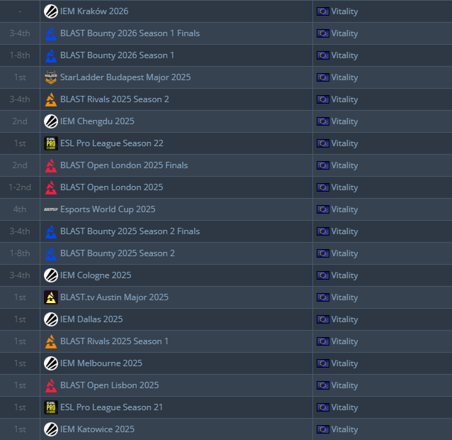 随着IEM克拉科夫小组赛阶段胜者组决赛的结束,Vitality击败Aurora率先闯入半决赛,确定了至少四强的成绩。这是Vitality自去年IEM卡托维兹以来,连续第17次闯入赛事的四强阶段。