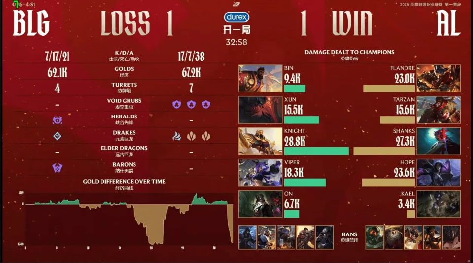 第一局比赛,BLG蓝色方,禁用:杰斯;发条;沙皇;鳄鱼;塞恩,选用:Bin狼母;Xun赵信;Knight瑞兹;Viper韦鲁斯;ON露露;AL红色方,禁用:石头人;兰博;芸阿娜;巴德;牛头,选用:Flandre雷克赛;Tarzan潘森;Shanks蛇女;Hope希维尔;Kael妮蔻