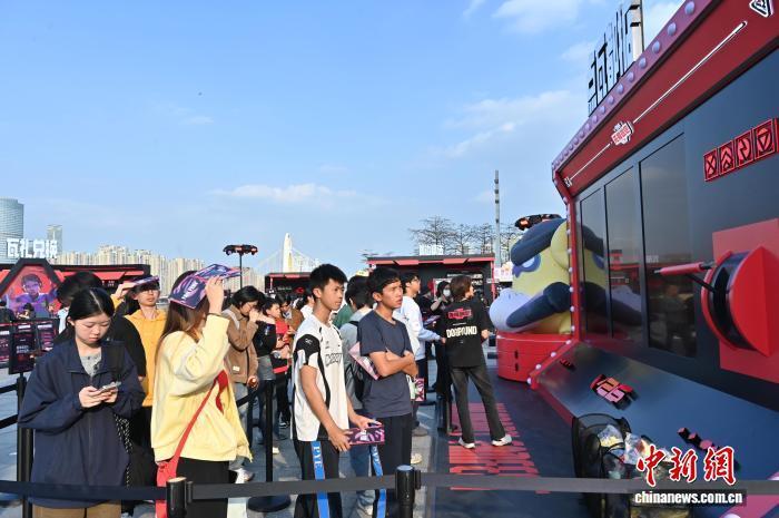 图为互动游戏吸引观众排队体验。中新社记者 陈楚红 摄