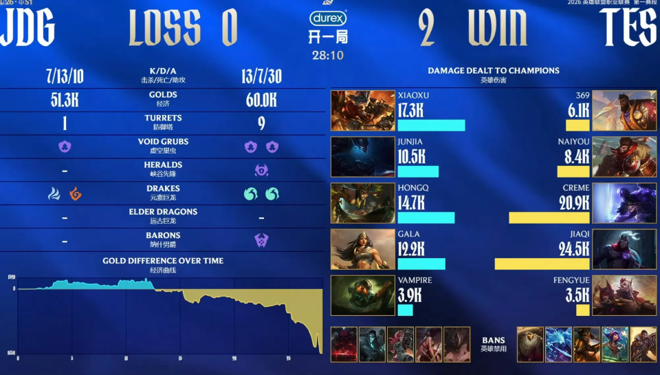 随着比赛的开始,jdg战队的状态渐渐凸显出来,双杀了blg战队之后,大家都觉得他们会非常的突出。结果在后面的比赛却接二连三的翻车,尤其是和Tes战队的这场对决,面对几乎是ldl选手阵容的情况下,他们竟然被二比零横扫了,甚至把辅助选手风月都给打出自信了。第一局对抗,前期双方打的还是比较谨慎的,Jdg战队也是凭借着运营取得了一些经济上的小优势,但他们的打野选手Junjia太想做事情了,一直激进的抓人,导致整个队伍的节奏完全被带乱了。