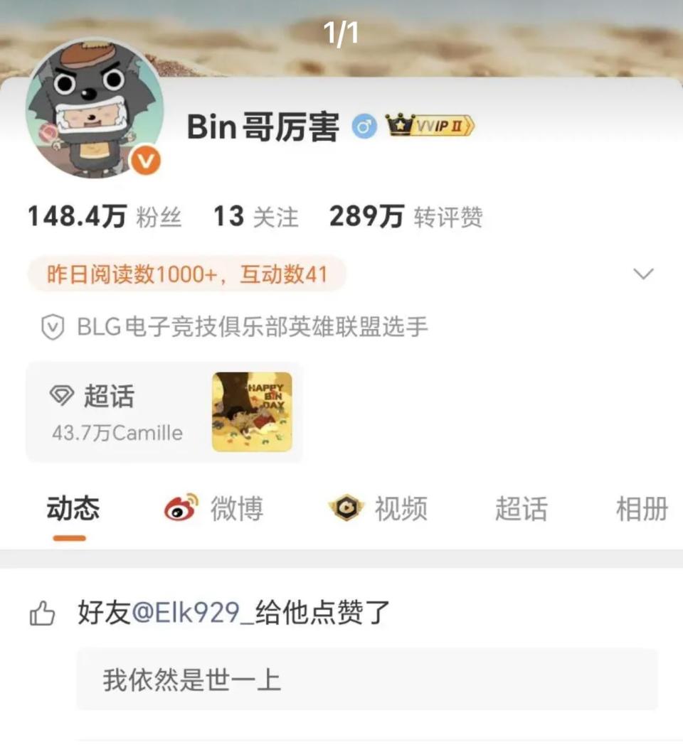 好兄弟!Elk火速点赞Bin“我依然是世一上”的社媒