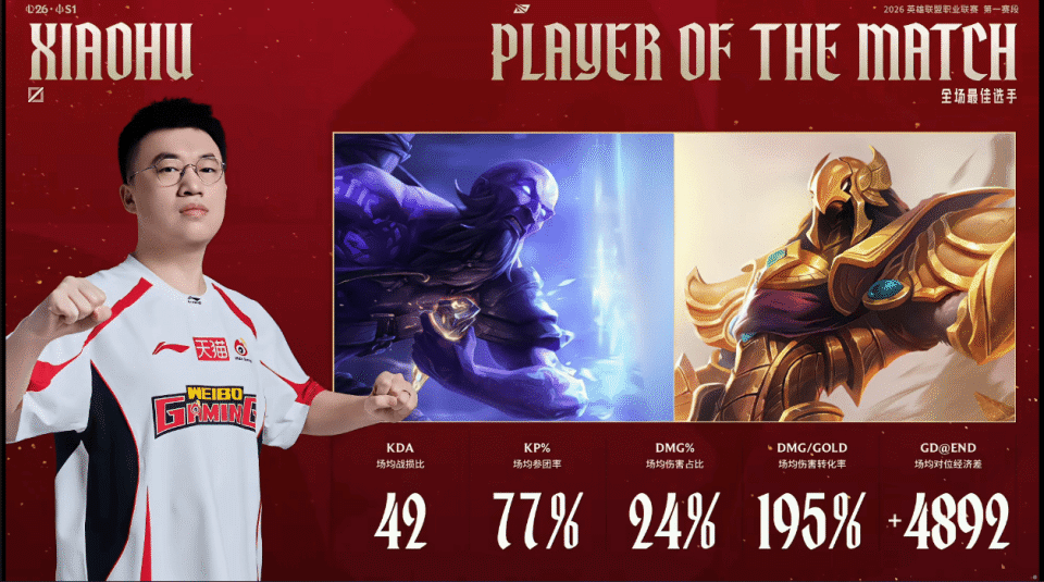 Xiaohu凭借场均42KDA,斩获WBG对阵IG大场MVP