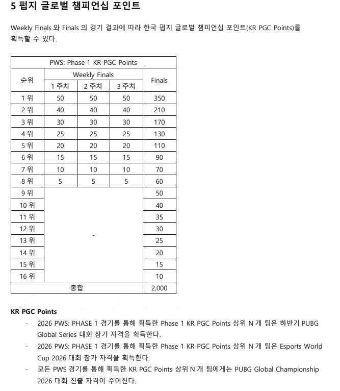 通过所有PWS比赛获得的KR PGC积分排名前N名的队伍将获得参加PUBG全球锦标赛2026的资格。