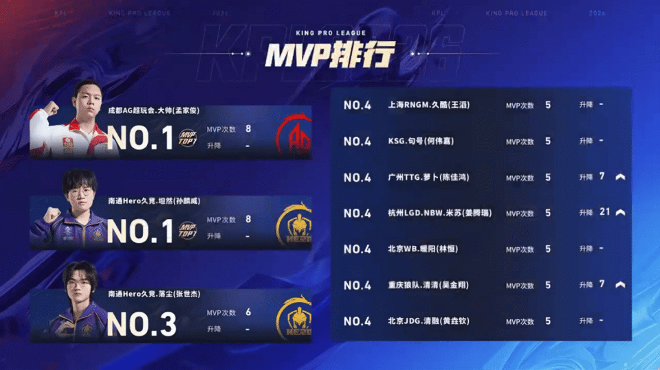 AG大帅11 (孟家俊)与南通Hero久竞_坦然 (孙麟威)累计获得8次MVP,并列第一;