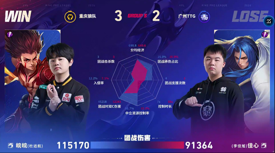TTG/狼队第五局数据对比:皖皖哪吒团战伤害高达十一万