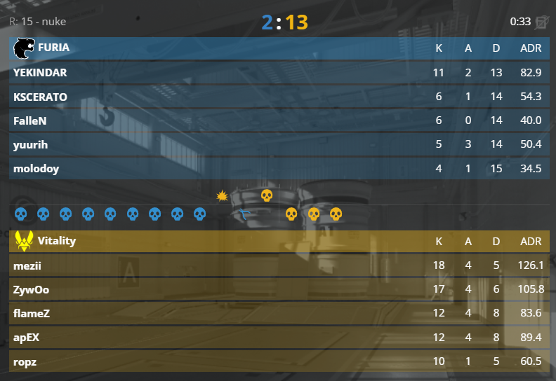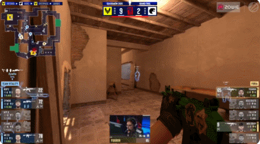 图三Nuke上法国双雄火力全开,薯薯内场大狙无解3杀,大黄蜂以恐怖的防守打出9-0碾压开局。依靠教父灵活选位完成2V3,半场才拿两分。换边Vitality再拿手枪局碾压黑豹,再下一城。