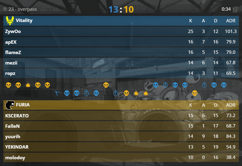 图四Overpass,薯薯4杀粉碎黑豹4B重防拿下手枪局,而后apEX也在B单局4杀,大黄蜂杀穿黑豹防线5-0开局。卡神完成1V2回防才取得首分,随后molodoy大狙连续发挥,狂哥手感也越来越热,黑豹半场追至6平。换边FURIA赢得手枪局9-6反超,长枪局火仔下水道绕后4杀,apEX掌握丹麦核心科技穿板单局4杀,关键局薯薯单A在车头大狙4杀拿到赛点!比赛再无悬念,大黄蜂以一波7-1铁血防守终结比赛。