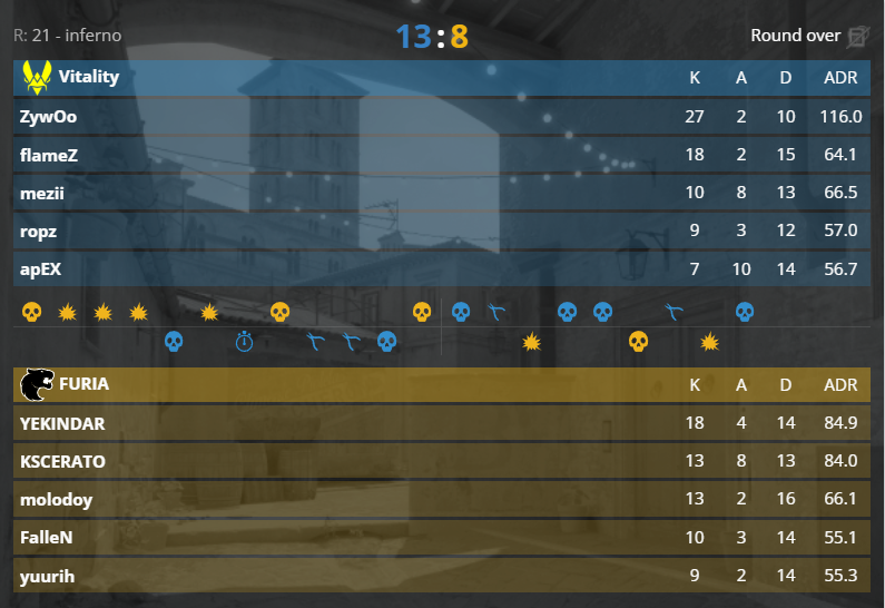 图二Inferno,大黄蜂拿下手枪局进攻势如破竹,薯薯、火仔拿下2V4残局,打出6-2强势开局。而后依靠薯薯连放三炮和狂哥的连番责任,黑豹追至5分。换边Vitality再赢手枪局,尽管卡神与教父打赢2V3,但薯薯彻底放飞自我单图狂轰27杀,大黄蜂稳稳扳回一城。